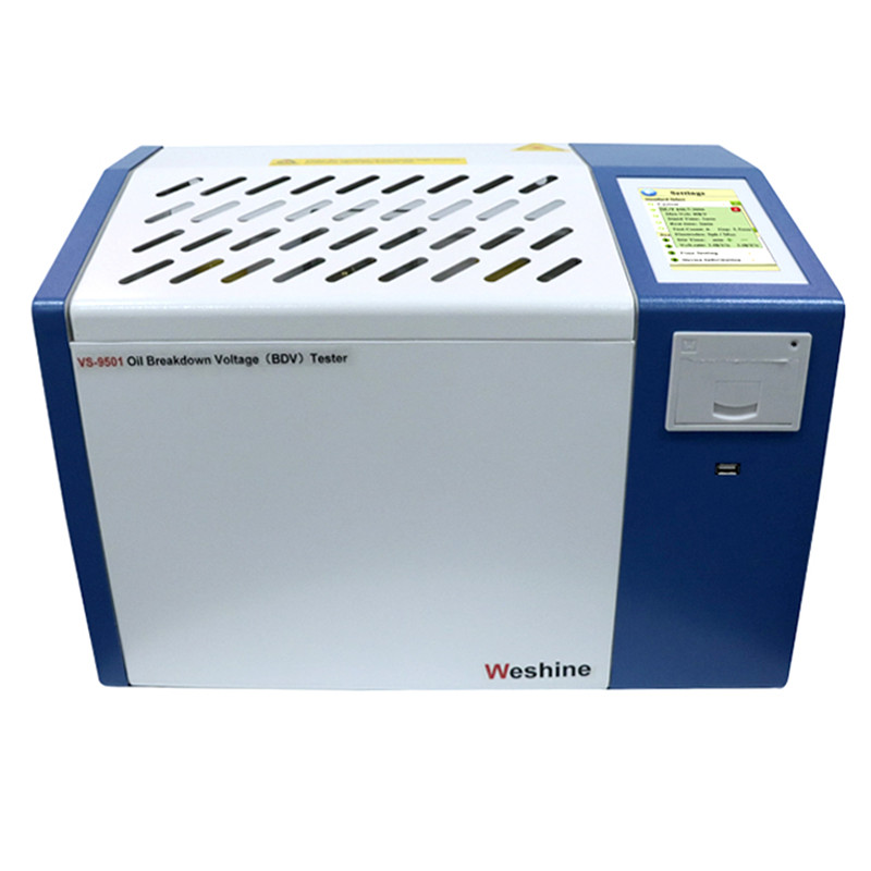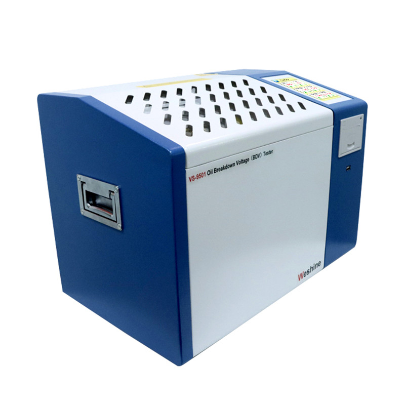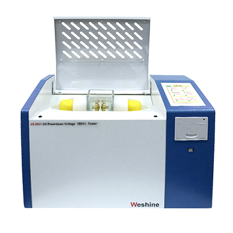 Весхине изуми ВС-9501 серију је потпуно аутоматски БДВ тестни кит за трансформаторско уље дизајниран са напредним технологијама за мерење БДВ теста трансформаторског уља, који има способност брзог сензора за мерење тачног пробојног напона. Серија је у складу са националним и међународним стандардима за тест секвенце и такође има прилагођене тест секвенце прилагођене кориснику. Серија долази са великим екраном осетљивим на додир у боји за лаке операције. Опремљен је интерном меморијом за складиштење до 100 тестова и уграђеним термалним штампачем за штампање извештаја на лицу места. Што се тиче безбедности, наша серија машина за тестирање трансформаторског уља има функцију откривања отвореног тла како би се избегла оштећења. Изливена посуда за испитивање уља је погодна за испитивање минерала, естарских и синтетичких уља и долази са подесивим подешавањем размака електрода за спровођење тестова према стандардима.