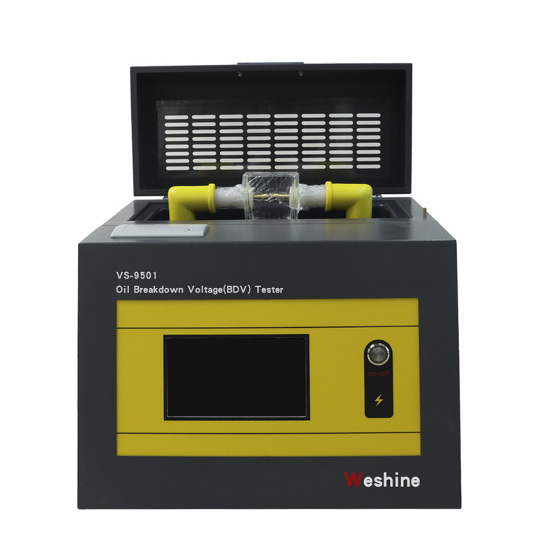 Весхине изуми ВС-9501 серију је потпуно аутоматски БДВ тестни комплет за трансформаторско уље дизајниран са напредним технологијама за мерење електричне диелектричне чврстоће уља, који има способност брзог сензора за мерење тачног пробојног напона. Серија је у складу са националним и међународним стандардима за тест секвенце и такође има прилагођене тест секвенце прилагођене кориснику. Серија долази са великим екраном осетљивим на додир у боји за лаке операције. Опремљен је интерном меморијом за складиштење до 100 тестова и уграђеним термалним штампачем за штампање извештаја на лицу места. Што се тиче безбедности, наша серија машина за тестирање трансформаторског уља има функцију откривања отвореног тла како би се избегла оштећења. Изливена посуда за испитивање уља је погодна за испитивање минерала, естарских и синтетичких уља и долази са подесивим подешавањем размака електрода за спровођење тестова према стандардима.
