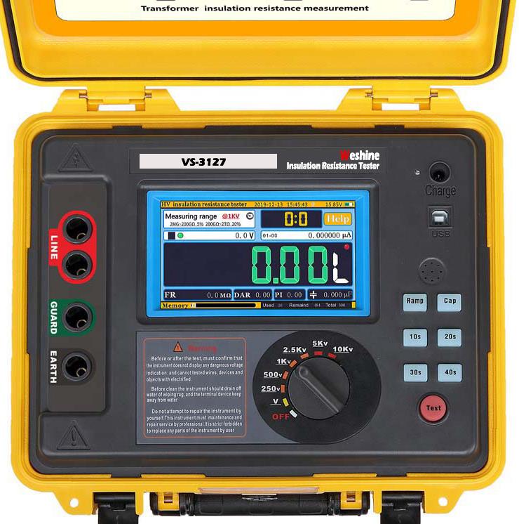 ВС-3127 ВС-3127Испитивање изолације трансформаторануди могућност извођења прецизних мерења отпора изолације до 15 кВ тест напона са максималним отпором од 30 ТΩ. Тачност мерења отпора је ± 5 % од 1 МΩ до 3 ТΩ! За комуналне и услужне компаније ВС-3127 је свеобухватан тестер са својом флексибилношћу и могућношћу провере у будућности. Весхине ВС-3127 је дизајниран да ради где год да радите. Излазни називни напон максимално достиже 7 брзина (250В, 500В, 1КВ, 2.5КВ, 5КВ, 10КВ, 15КВ). Максимална струја кратког споја 7мА Тест изолационог отпора (ИР), тест индекса поларизације (ПИ), тест односа диелектричне апсорпције (ДАР). Режим тестирања рампе (РАМП), режим тестирања филтрираног отпора (ФР). *Тест капацитивности (Цап.). Функција монитора напона, аутоматски прати мерни напон