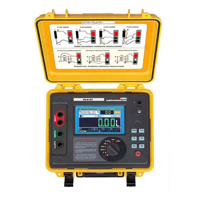 Весхине® ВС-3127 се напаја батеријамаТест мегоом мерачаса дигиталним и аналогним лучним дисплејом, дизајнираним за испитивање отпорности изолације високог напона у одржавању и сервисирању каблова, машина за ротирање постројења, трансформатора, расклопних уређаја и индустријских апликација.